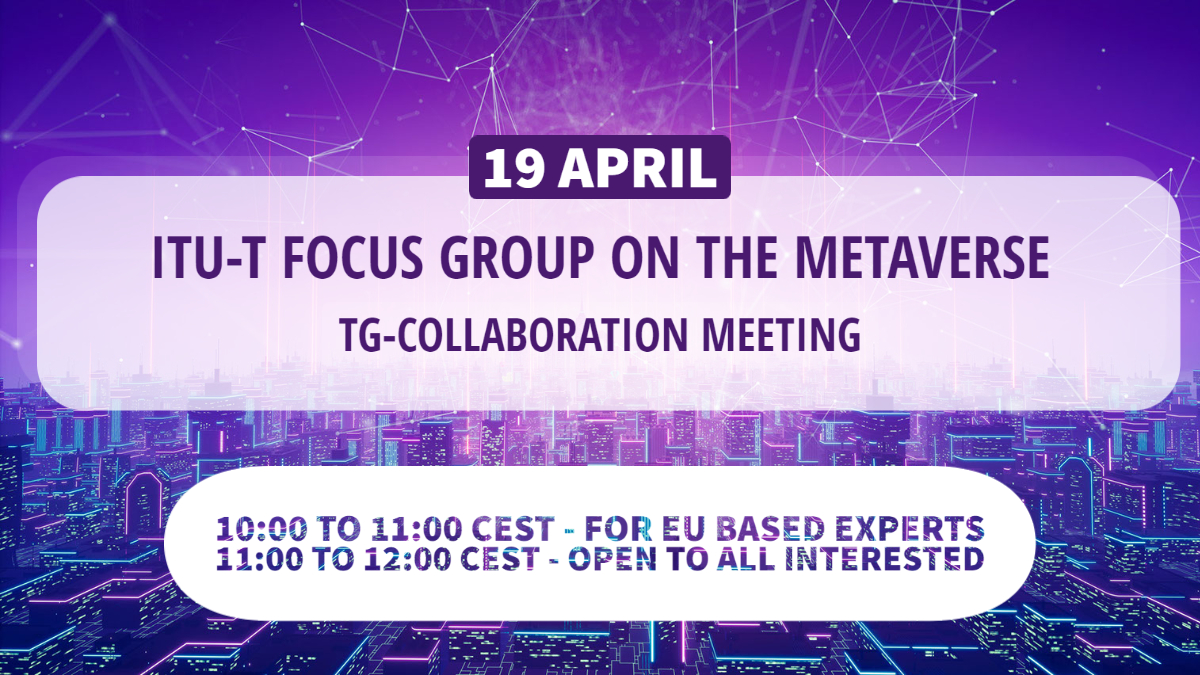 As part of the recently created ITU-T focus group on the metaverse, you are invited to the on-line meeting under TG-collaboration that will be held on 19 April 2023 from 10:00 to 11:00 (CEST), for EU-based experts only. In the meeting we would like to get to know all of you, understand your expectations and particular interests and needs, and explore ways as well to collaborate and foster EU’s efforts under FG-MV.