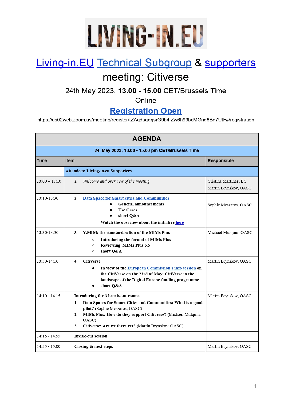 The meeting invites all technical subgroup members of the Living-in.EU movement to join us online on the 24th of May from 1pm until 3pm (CET, Brussels Time). During this meeting, we will present the CitiVerse concept and call, with presentations of cases already unfolding the foundations of a CitiVerse based on the Living-in.EU movement. The purpose of this meeting is to provide supporters with an understanding of the needs and requirements of signatories and how they can contribute to the development of CitiVerse. We look forward to seeing you online.